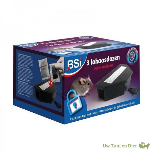 Deze oerdegelijke lokaasdoos voor muizen van BSI biedt een beschutte voederplek. Het lokaas blijft er droog en aantrekkelijk. De muizenlokdoos heeft twee zijdelingse openingen en is vrijwel onverslijtbaar. De doos kan worden afgesloten met een kunststof sleutel zodat kinderen niet bij het lokaas kunnen.