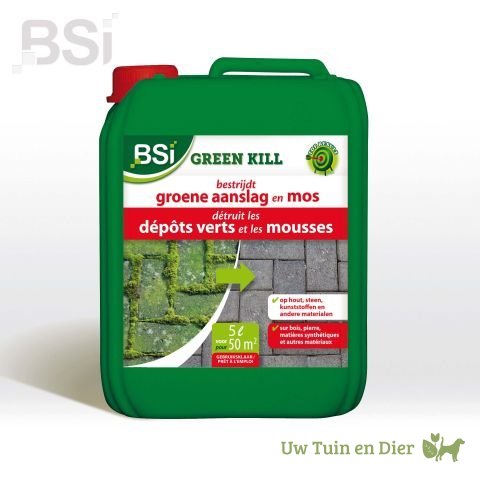 Tegen het gelijktijdig voorkomen van MOS en GROENE AANSLAG kan je Green Kill gebruiken. Dit gebruiksklare product werkt snel en is veilig voor alle oppervlakken en ondergronden. Het beste resultaat bekom vanaf een gemiddelde temperatuur van 10°c en bij zonnig weer.