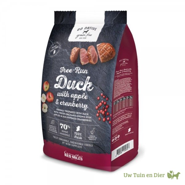 SAMENSTELLING: Vers bereide eend 40%, gedehydrateerde eend 25%, aardappelzetmeel, zoete aardappel, eendenvet 7%, erwtenzetmeel, heel lijnzaad, gedroogd zeewier, gehydrolyseerde leverproteïne 1%, natriumchloride, gistextract, gedroogde appel (gelijk aan 5% verse appel), gedroogde cranberry's (gelijk aan %% verse cranberry's), glucosaminehydrochloride, chondroïtinesulfaat