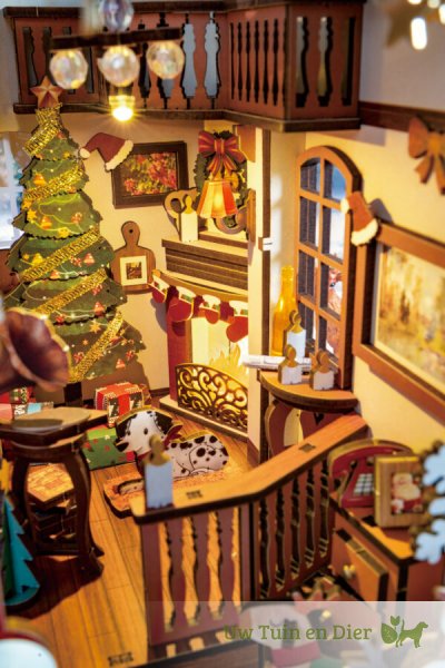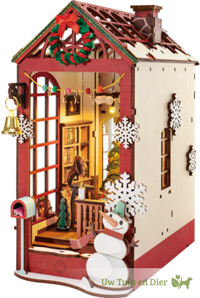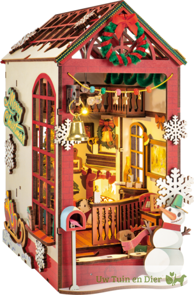 De Robotime Book Nook Christmas Indoor Scene is een sfeervol houten bouwpakket van Rolife, speciaal ontworpen voor volwassenen en iedereen vanaf 14 jaar. Je kijkt door het dak naarbinnen naar een prachtig versierde kerstboom, met glinsterende decoraties en een gouden ster die de top siert. Naast de boom heb je een veranda, een lachende sneeuwpop met een rode sjaal, een schattige Dalmatiër en een vintage grammofoon die een nostalgische touch aan het geheel geven.