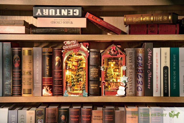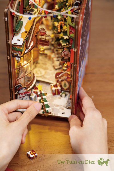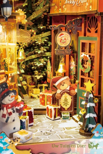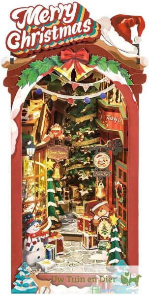 De TGC06 Robotime Book Nook Christmas Street is een betoverend houten bouwpakket van Rolife, speciaal ontworpen voor volwassenen en jongeren vanaf 14 jaar. Dit charmante model stelt een sfeervol kerststeegje voor, met winkeltjes die kleine ruitjes hebben en versierd zijn met sneeuw. In het hart van deze feestelijke scene staat een knusse kerstboom, omringd door kleurrijke kerstcadeautjes en een lachende sneeuwpop. De winkel met de naam Funny Toys straalt vreugde uit en op de book nook staat Merry Christmas prominent op de gevel.