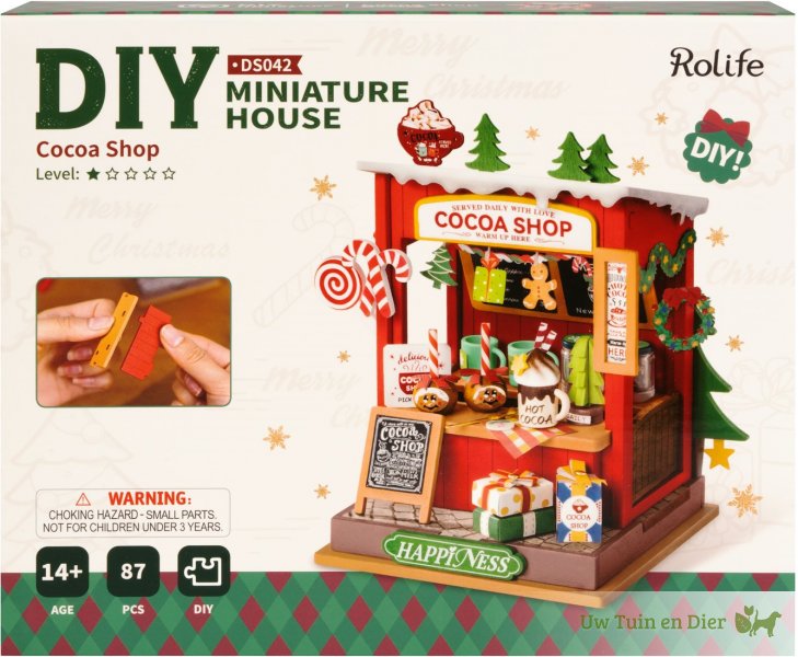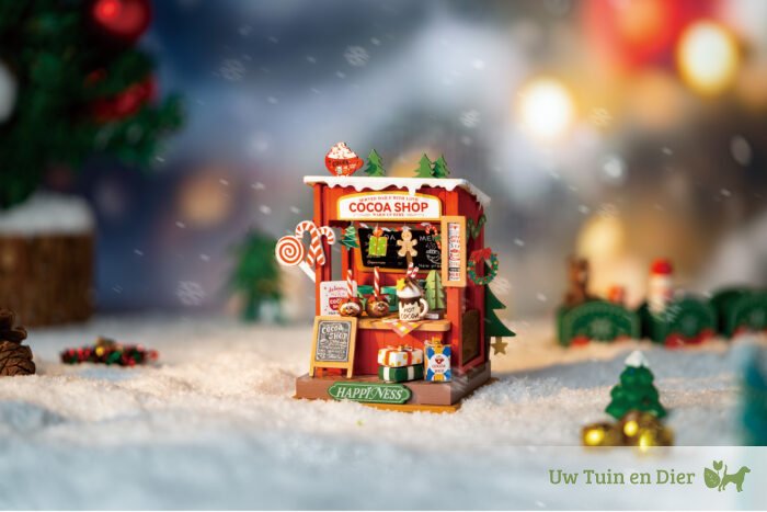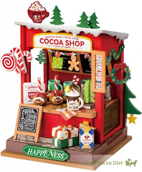 De Robotime Cocoa Shop is een heerlijk houten bouwpakket, perfect voor zowel volwassenen als kinderen vanaf 14 jaar. Dit charmante chocoladekraampje van Rolife zit boordevol sfeervolle details, waaronder bekers met rietjes en slagroom, een kerstboom, cadeautjes en een gezellig menubord. Hier bestel je je warme cacao en waan je je in een winterse kerstsfeer, compleet met feestelijke versieringen.