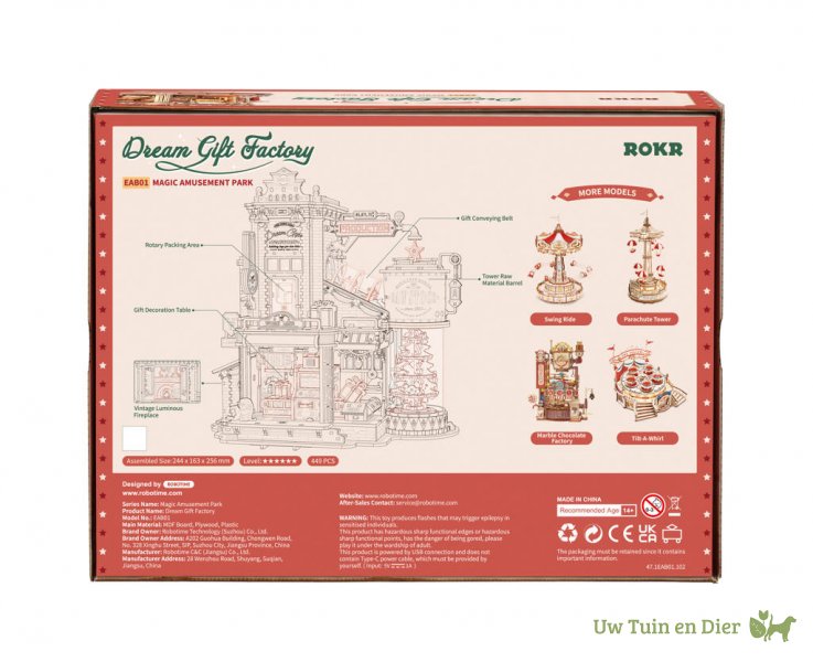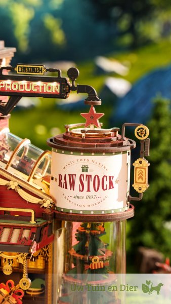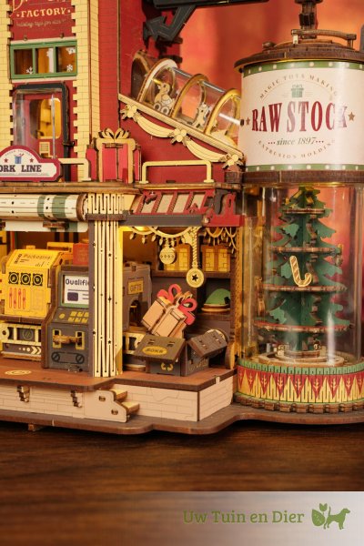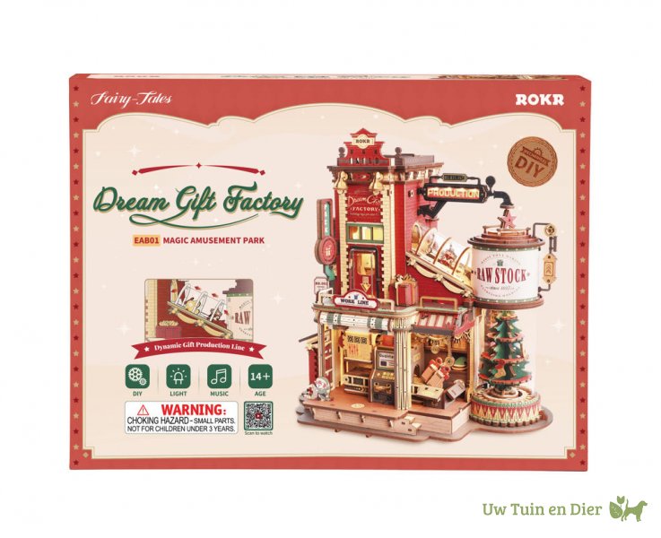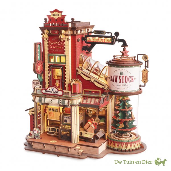 Laat je betoveren door de feestelijke sfeer van kerst met dit unieke houten bouwpakket: de Dream Gift Factory! Stap naar binnen in een knusse, sfeervolle kerstfabriek, met een verlichte openhaard, warme ledlampjes en een vrolijk muziekje op de achtergrond. De traditionele rode kleuren passen perfect in een klassiek kerstdecor. Achter de ramen zie je ijverige kabouters druk bezig met het inpakken van cadeautjes. In de fabriek worden strikken op de pakjes gelegd en een schattige kerstkabouter schudt enthousiast een sok leeg. Een prachtige draaiende kerstboom in een glazen cilinder maakt het plaatje helemaal compleet. Echte kerstsfeer in jouw nieuwe houten bouwpakket!