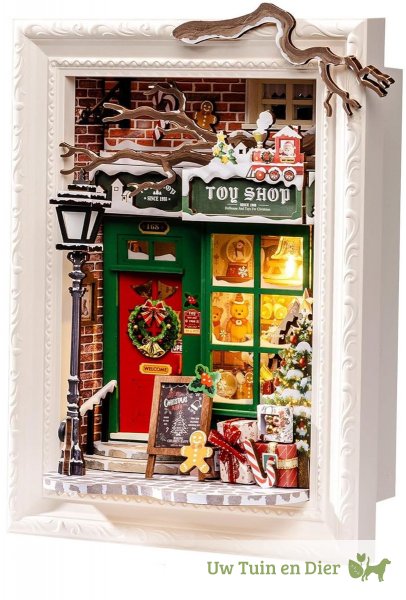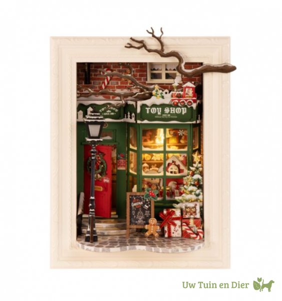 De Santa's Toyshop van Robotime is een superknus houten bouwpakket met ledlampje in de vorm van een 3D-schilderij voor volwassenen en kinderen vanaf 14 jaar ongeveer. Dit tafereel stelt een kerstwinkel voor zoals we die in de vorige eeuw zagen in Engeland. Een erker met kleine ruitje, sneeuw, kerstboom, alles ademt kerst uit. De sfeervolle details zijn erg geliefd bij modelbouwers van miniaturen.